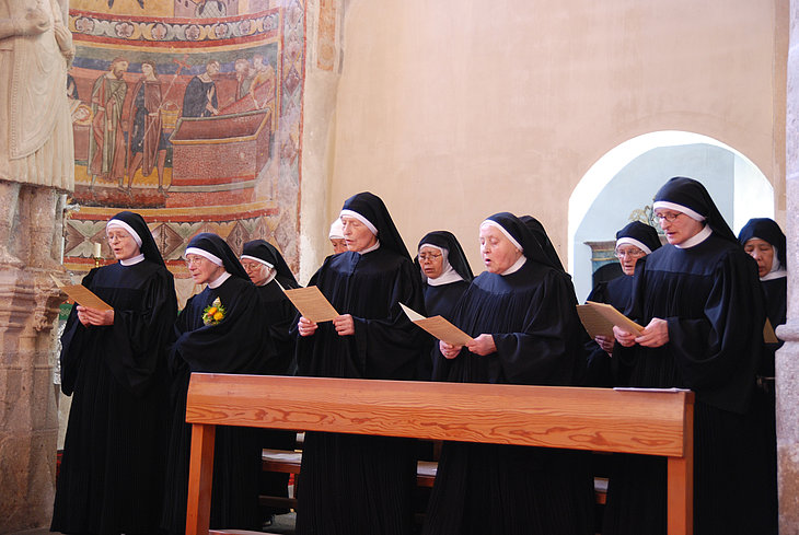 Die Benediktinerinnen von Müstair feiern ihr Stundengebet in den Sommermonaten in der Klosterkirche auf der Nonnenempore. Besucher können diesem Gebet gerne beiwohnen und durch das Rezitieren der Psalmen Versenkung und innere Ruhe finden.