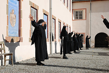 Wenn Sie die Nonnen von Müstair nach dem Beweggrund für ihre Entscheidung ins Kloster einzutreten fragen, dann wird Ihnen jede eine andere Geschichte erzählen. Allen gemeinsam ist aber der Wunsch, Gott näher zu kommen. Der Weg ins Kloster ist aber nicht einfach mit einem Schritt getan, es ist vielmehr ein Hineinwachsen, ein stetes Lernen. Benedikt vergleicht das Kloster mit einer „Schule für den Dienst des Herrn“ (RB, Prolog,45). Er selbst sagt, dass der Weg am Anfang nicht anders sein kann als eng. „Wer aber im klösterlichen Glauben fortschreitet, dem wird das Herz weit, und er läuft in unsagbarem Glück der Liebe den Weg der Gebote Gottes.“ (RB, Prolog, 49)Heute sind es neun Frauen, die die benediktinische Spiritualität im Kloster St. Johann in Müstair täglich leben. Seit Januar 2013 steht Sr. Domenica Dethomas der Klostergemeinschaft vor. Ihre offene und humorvolle Art zeigt, dass „Nonne sein“ nicht nur Ernst und Strenge bedeuten.